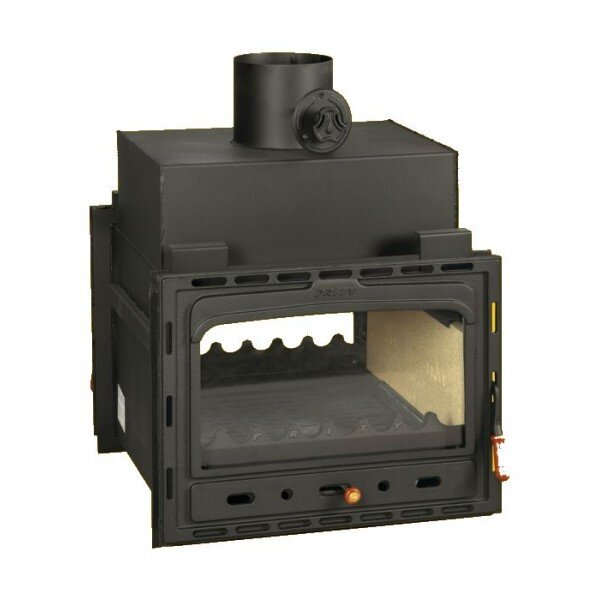 Leistungsstarker doppelseitig verglaster Kamineinsatz mit gusseiserner Tür. Er ist mit Schamotteplatten ausgekleidet und verfügt über einen gusseisernen Rost. Die Primärluftzufuhr wird über einen Aschekasten geregelt, die Sekundärluft spült das Glas. Material: 3 mm Stahlblech. Selbstzündende schwarze Farbe. Der Einsatz ist mit einer Rauchschutzklappe ausgestattet.